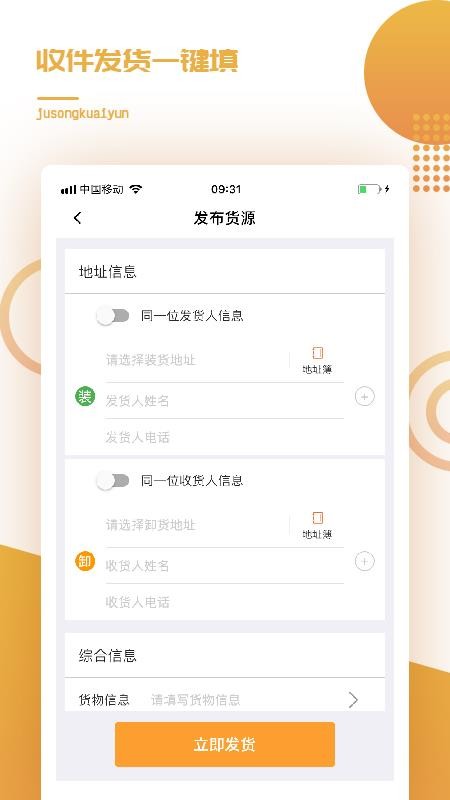 橘送快运app是一款为货主提供货运服务的软件应用,用户可以快速的在线发布货运需求,让符合要求的车主接单,为用户提供运输服务;在这里,用户可填写发货地址、收货地址、发货人电话、收货人电话、货物、车辆要求等信息,就能将自己的需求发布,等待车主接单;同时,在车主接单以后,实时跟踪货物,将各种物流信息直观的展现在用户的面前,用户可自由的进行查看,了解到详细的物流情况;除此之外,还为用户提供了海量的优惠券,轻松即可领取,使用优惠券下单会更加的便宜,让用户花费实惠的价格,就能将货物进行运输。