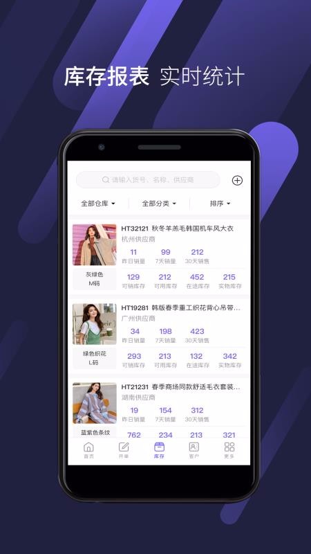 云衣宝app是一款进销存管理软件;该软件主要服务于服装零售门店,可以在这里进行商品管理,支持新增商品,随时可以查询库存详情,从而明确管理所有的商品;不仅如此,还可以随时随地开单,打开手机就能办理,节省商家管理时间;提供客户管理功能,能够直接浏览客户列表,可以随时新增客户,从而更有效的维护客户,提升门店销售量;此外,该平台将会及时统计推送经营报表,可以直接浏览最新报表,能够及时获取经营详情;管理店铺更加方便,管理方式多样化,赶紧下载这款软件尝试更多功能吧。