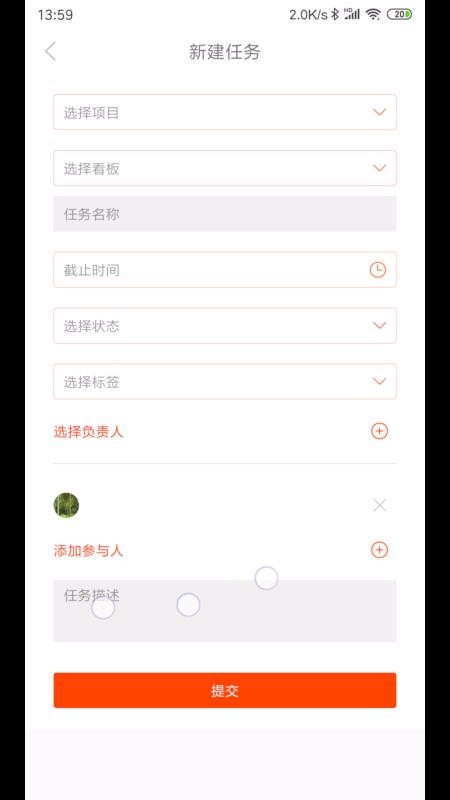 4、拥有丰富的新建任务选择列表,新建任务页面设置了项目选择、看板选择以及参与人添加等内容;