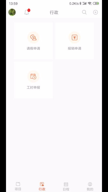 1、简单实用的行政中心,这里设置了三个功能,分别是报销申请、请假申请以及工时申报;