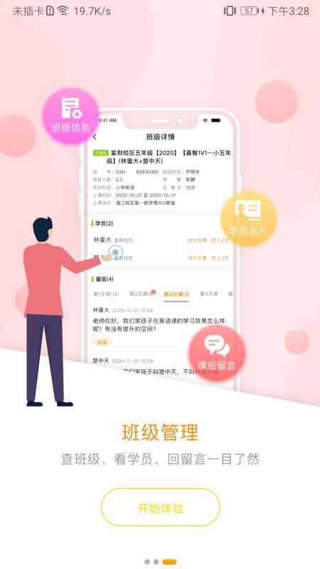2、进入首页,查看推送的消息提醒,或者选择上课签到、学员评分、我的班级等功能