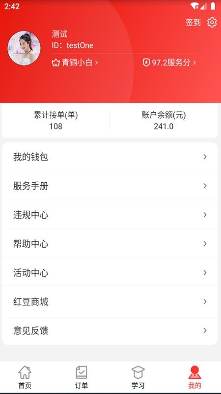 5、打开个人中心,查看自己的累计接单数量和账户余额信息,了解钱包明细