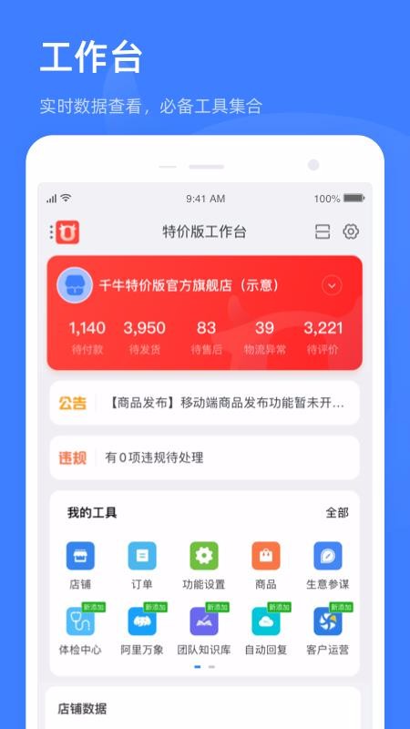 千牛特价版app是专为商家打造的管理软件;淘宝特价版商家可以使用这款软件在线管理订单,能够及时接收到新订单详情,可以完整管理所有订单;这里还推送商品管理功能,可以直接浏览商品信息,能够一手管理所有商品;可以设置自动回复,设置后可以精准回复顾客,从而有效维护顾客,提升店铺服务效率;这里还有团队知识库,可以自主浏览众多知识,能够高效学习;该平台将会实时统计显示待付款、待发货、待售后以及物流异常数据,商家可以随时查看核对;使用千牛特价版app,可以减轻商家工作负担,赶紧试试吧。