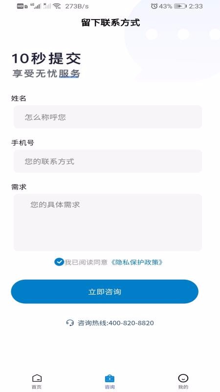 3、快捷方便的咨询服务中心,里面设置了便捷的信息填写栏,只需按引导即可轻松填写提交;