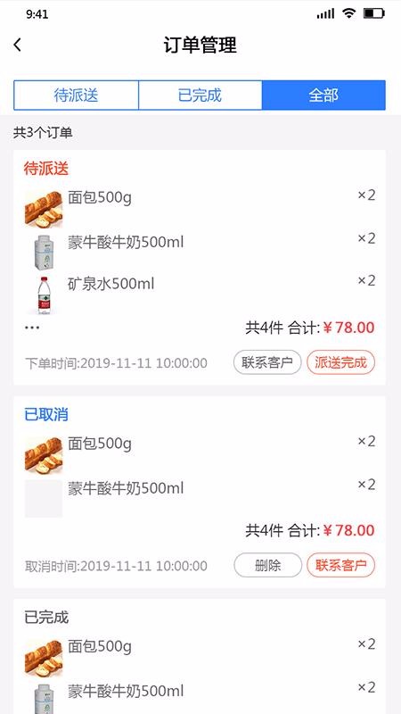 4、便捷的订单处理工具标签,不同订单上拥有对应工具,比如派送完成和删除等;