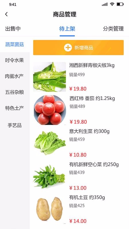 1、拥有多种商品管理栏目,这里面划分了出售中、待上架和分类管理三个栏目;