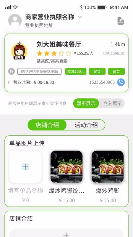 5、自定义编辑店铺介绍,可以上传店铺图片并完善位置信息、活动信息等;