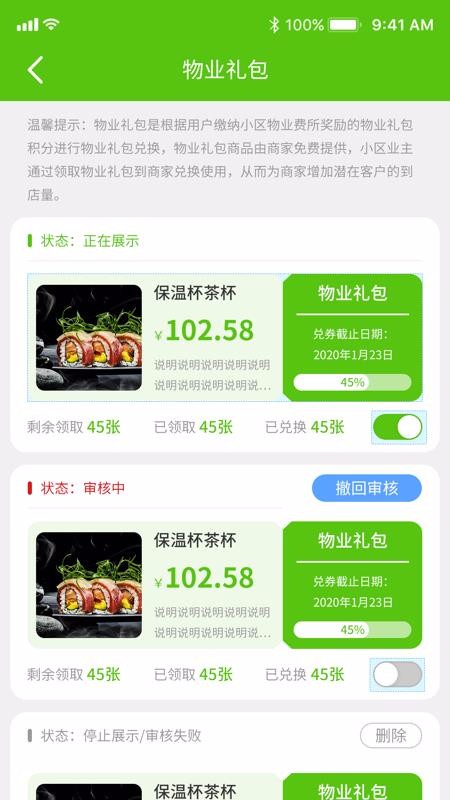 5、点击进入物业礼包页面,查看各礼包的审核状态,并删除未展示的礼包