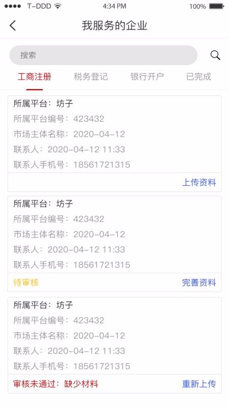 4、分类查看服务的企业信息,并进行上传资料、完善资料、重新上传等;