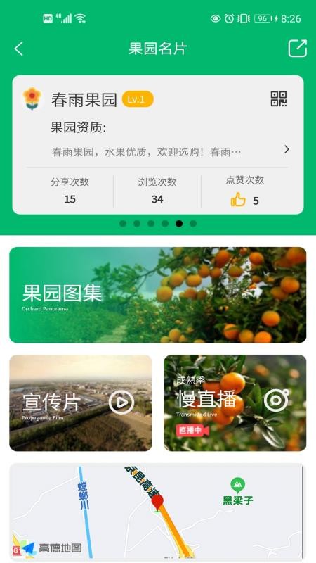 2、分享果园的名片,随时分享自家果园的名牌信息,在线宣传果园;