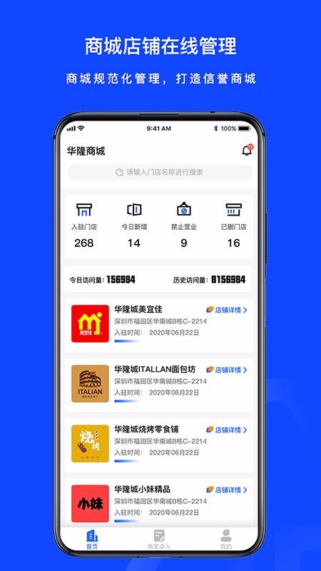 1、支持商家录入,便捷的录入入驻店铺的信息,随时可以查看录入的详情;