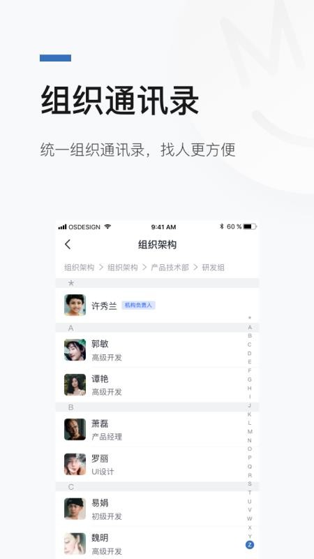 5、对各个成员进行了首字母排序,让用户能够更轻松的找到自己要联系的组织成员;