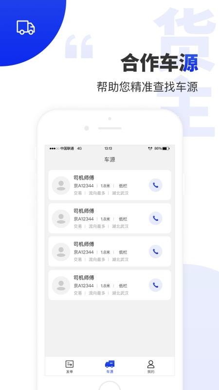 4、进入车源版块,查看各个司机师傅的车辆信息,和师傅快速进行电话沟通