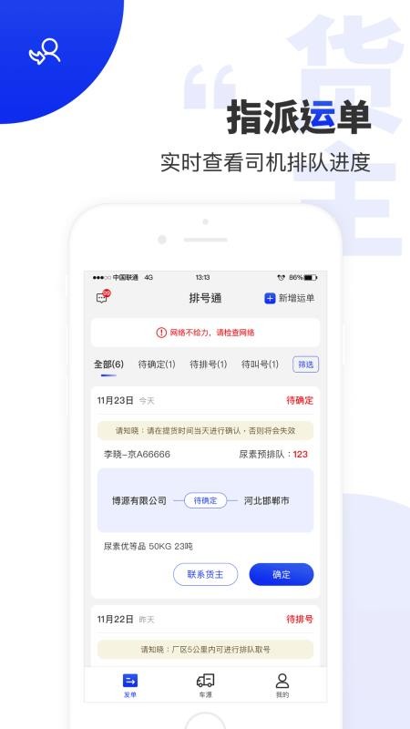 2、在首页中查看自己发布的各个运单信息,了解司机排队情况,一键新增运单