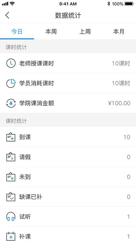 5、提供数据统计版块,帮助用户统计每天和每周、每月的课时和签到信息;