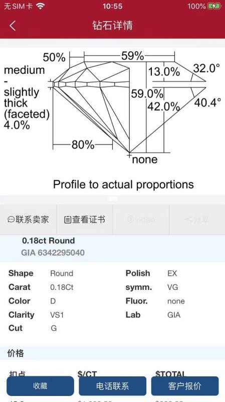 4、进入钻石详情版块,查看钻石的详细构造,查看钻石证书内容,和卖家在线联系