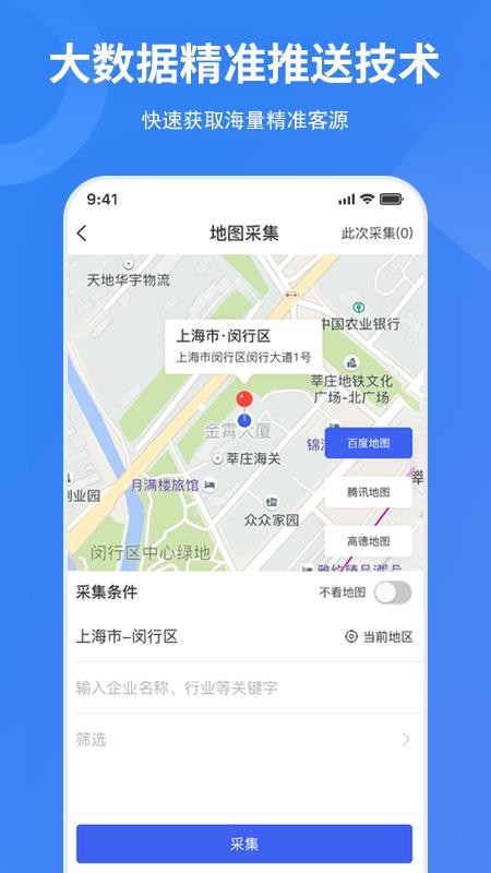 1、地图采集,用户可在地图上定位,输入企业名称、行业等关键字,完成采集;