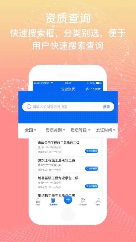 资质信app一款集资质合作、资质查询、资质代办和资质转让为一身的平台,它可以为用户提供便捷的查资质服务,让用户能快速的了解到各种资质信息;应用众多的资质信息,各行各业企业资质信息用户都可以随心的进行查看,快速的在手机上获取到重要的信息,非常的具有实用性;在这里,每个用户都可以输入关键字,系统就会根据用户输入的内容,在数据库中进行快速的搜索,将对应的资质信息直观的显示在用户的面前,让用户能迅速的找到自己所需要的信息;同时,用户还可通过资质的类别,将所选类别的资质信息展现出来,节约用户的查找时间,非常的方便快捷。