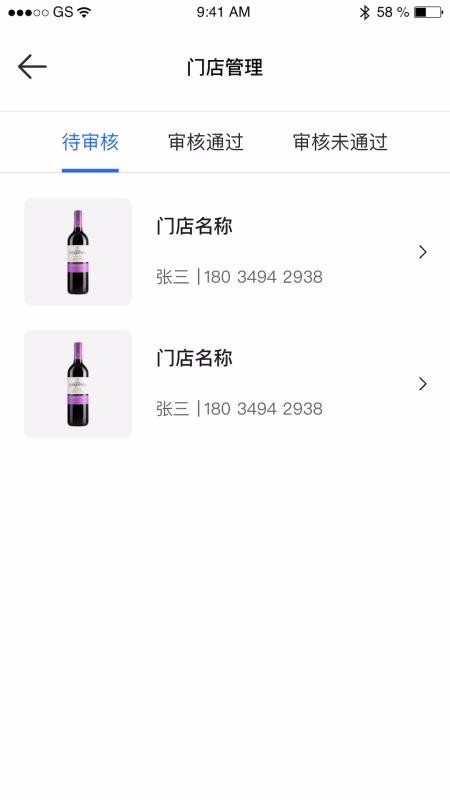 1、简单清晰的门店审核状态栏目,该栏中展示待审核、审核通过和审核未通过栏目;