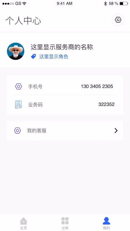 6、简单的个人主页,我的主页展示自己名称、手机号和业务码等信息;