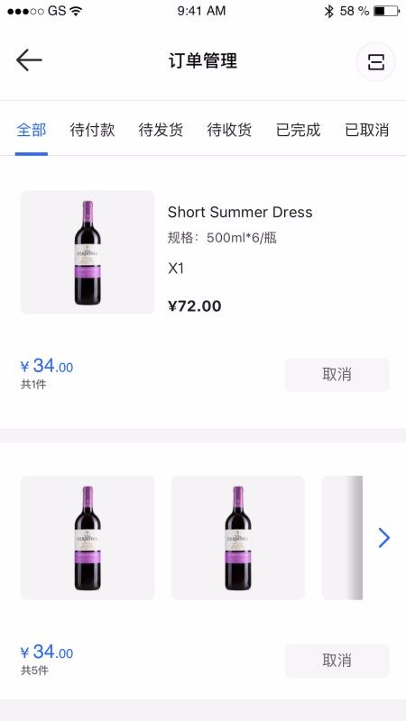 6、浏览查看不同状态订单,在订单管理页面中切换不同状态查看相应订单;