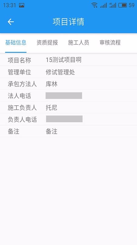 4、展示丰富的项目详情内容栏目,其中有基础信息、资质提报和施工人员等内容;