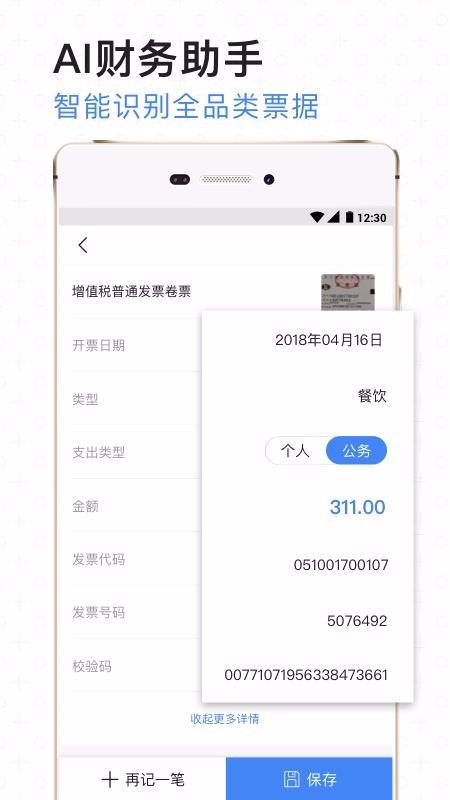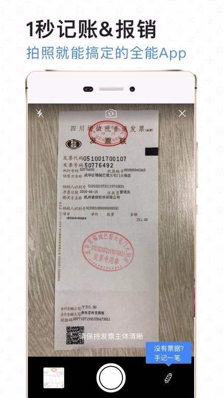 5、一键拍照记账,使用拍照功能拍摄发票并识别发票中的数据和类型;