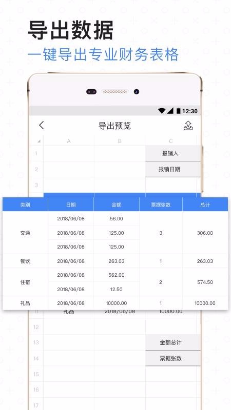 2、一目了然的数据预览表格,表格中展示了类别、日期、金额以及总计多种数据栏;