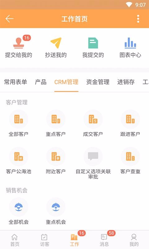 2、点击工作,立即选择资金管理、进销存管理或者产品管理等