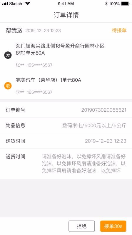 1、随时为你推送新订单,在倒计时结束前接单或拒绝;