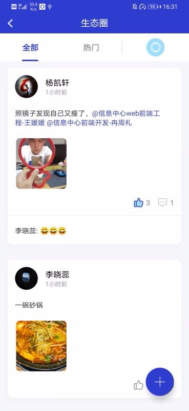 4、丰富多彩的生态圈,平台开设了一个自由分享的神态圈并展示所有同事发布的动态内容;