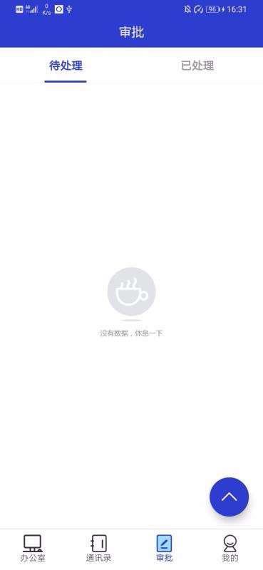 3、干净整洁的审批中心,里面划分待处理和已处理两个栏目,还有快捷方便的处理隐藏悬浮工具图标;