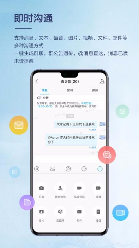 1、可以一键生成群聊,在线聊天时可以直接发送公告,提供消息已读提醒;