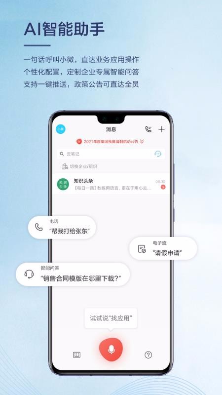 WeLink应用软件是一款智能化办公软件;这里有超齐全的办公工具,支持用户随意选择移动办公,提供考勤打卡功能,可以及时打卡,平台将会实时统计考勤;推送协同办公的功能,可以直接进行视频会议,还可以直接选择直播培训,助力企业员工更好的办公;实时统计工作详情,可以随时查看工作汇报内容,各类工作数据详细查看;平台还提供AI智能助手,可以自主选择一键呼叫小微,帮助用户及时解决更多使用问题;支持即时沟通,提供众多沟通方式,支持选择发送文字消息、语音、图片或者视频等传输相应信息,沟通更加便捷。