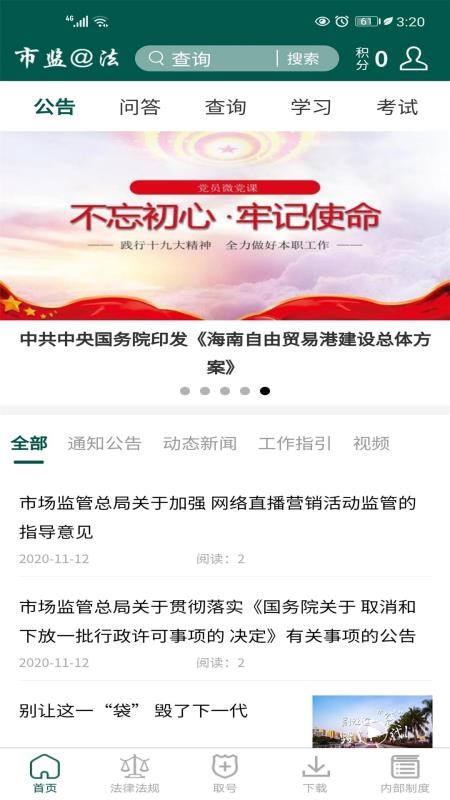 市监@法app是一款为市场监督管理局人员提供服务的软件,让用户能够在线学习各种监管相关法律法规,更轻松的工作;应用中有多种功能,用户可以在这里看到监管局的各种通知公告内容,了解监管局最新动态信息,合理安排自己的工作行程;用户通过软件可以在线查询各种信息,从而得知各种市场信息的合法和正规性,方便自己的监管工作;在这里,用户还可以找到各种学习和考试内容,帮助用户快速学习更多的业务知识,提高用户的业务办公能力;快下载这款软件试试吧,查看各种监管局动态信息,在线学习更多监管知识。