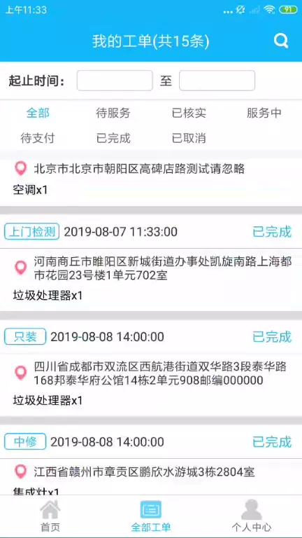 2、进入全部工单,输入时间段就能筛选查找相应的订单信息