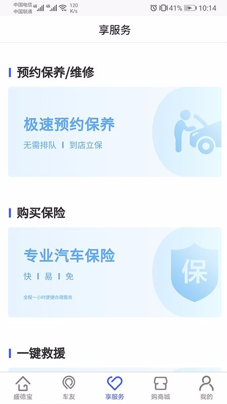 盛德宝app是专注于车辆服务办理的智能平台;这里有汽车租赁服务、汽车保养服务等,用户可以随意选择需要的服务办理,能够更好的管理爱车,可以获得更全面的汽车服务;平台提供商城,可以进入商城查看众多的汽车配件,购买配件更加便捷;不仅如此,这里还有车友互动交流功能,可以更便捷有效的沟通;这里还提供购买保险的服务,支持用户直接查看相应保险详情,全程一小时便捷办理服务;可以选择一键救援,能够得到有效的救援,出行更加的安心;可以直接查看车型展示,了解车辆详情,购车更清晰。