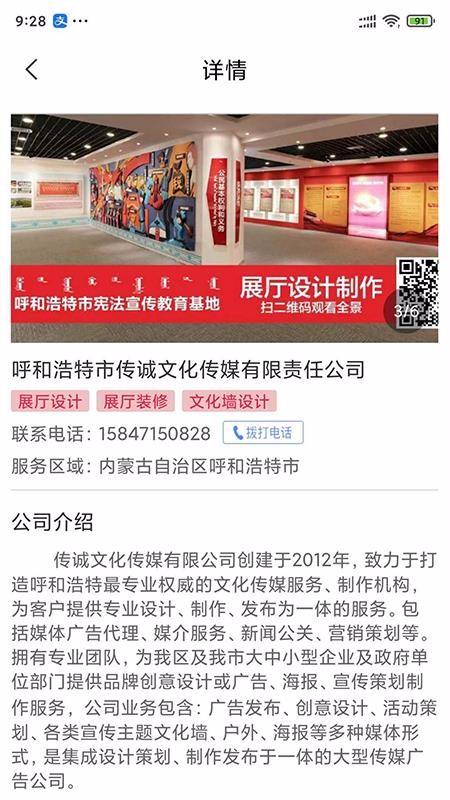 广告圈是一款广告行业资源共享与客户资源整合的app,企业入驻之后可以免费的发布广告资源,同时选择公司后可以一键拨打电话进行联系;在线即可发布资源信息或需求信息,相应的可以进行信息管理,可以随时进行修改或删除信息;在资源或需求信息页面,自行添加条件筛选符合的信息,比如地点、距离、人气等;选择地点后即可输入资源的关键信息进行搜索,可以让你快速的发现符合的信息;在公司详情页面,详细为你展示了公司信息、服务区域、联系电话等,同时还可以查看该公司制作的设计展厅,扫描相应的二维码即可观看全景。