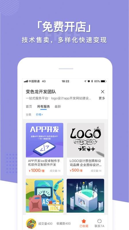 6、应用中有大量的开发团队店铺,用户可以快速查看各团队的服务内容,并且支持价格排序;