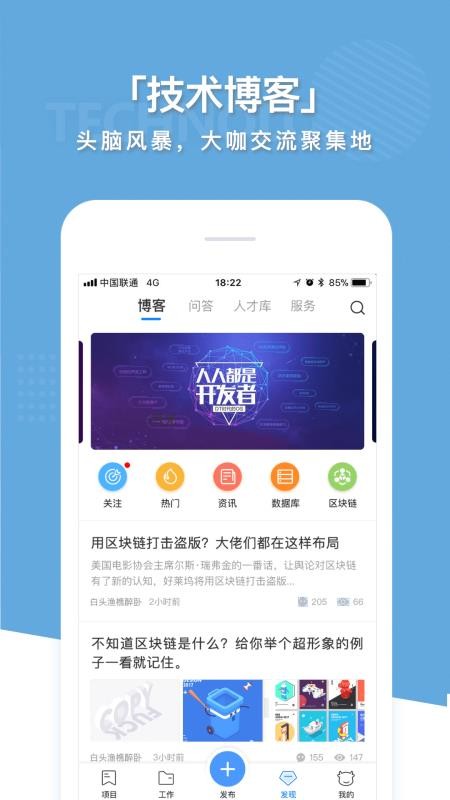 3、点击发现,查看各种博客内容,快速和行业大咖进行交流和讨论,学习更多行业知识