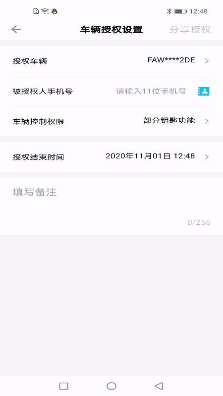5、进入车辆授权设置页面,选择授权车辆、手机号、时间等即可分享授权