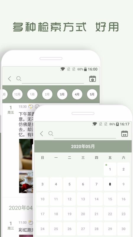 1、提供多种不同的日记查找检索方式,应用中设置了按照月份、每个月的日历视图以及搜索等多种检索功能;