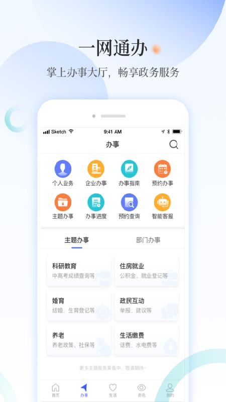 3、应用中有主题办事版块,让用户轻松办理科研教育、住房就业、婚育和养老等各种业务;