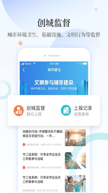 6、拥有创城监督功能,让用户能够更方便的上报各种城市卫生和文明行为信息,轻松参与城市建设;