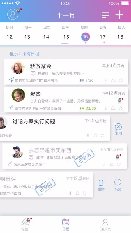 2、一键取消日程安排,便于快速处理行程,取消行程,便于安排其他的行程;