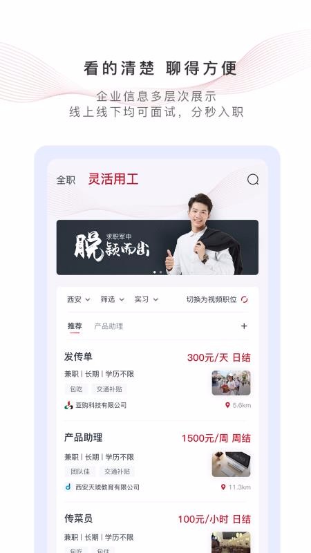 伯马乐业是一款服务于求职者和招聘者双方的多功能软件,拥有角色选择、职位搜索与发布、上传自我介绍视频等多种功能;求职主页面中展示了两种不同的职位类别资源栏目,同时提供了全职、灵活用工两种不同的职位类型栏目,可以在灵活用工栏目中看到下面丰富的灵活用工职位列表资源,这些资源中涵盖了发传单、产品助理以及传菜员等多种职业信息,还能通过上面的筛选栏自由筛选查找不同的岗位;该平台特别设置了视频展示的内容,不仅能看文字类型的职业信息内容,还可以切换到视频方式来查看相应的职位信息,同时支持编辑管理自己的视频。