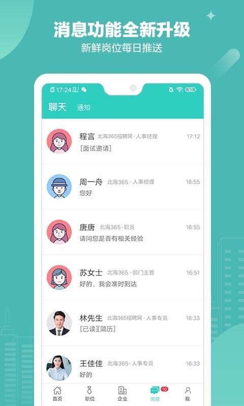 北海365招聘app是一款职位丰富的求职软件,让用户能够快速找到适合自己的职位,轻松的进行沟通;应用中包含多种类型的职位,用户可以在这里找到各个行业的岗位,满足不同用户的需求,让每一个人都可以轻松找工作;用户通过软件可以和HR们在线沟通,交流各种职位问题,快速的谈薪资、聊待遇,解决自己对职位的各种疑问,从而快速的找到工作;在这里,用户能够更轻松的筛选自己感兴趣的职位,节省用户的时间,让用户可以更快的入职获得收入;快下载这款软件试试吧,轻松找到各种各样的职位,在线沟通职位问题。