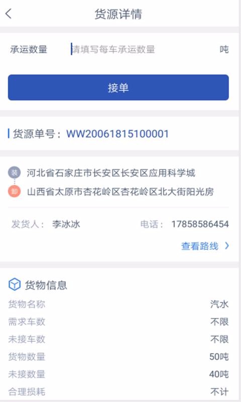 3、点击查看货源详情,直接选择查看路线,手动填写承运的数量