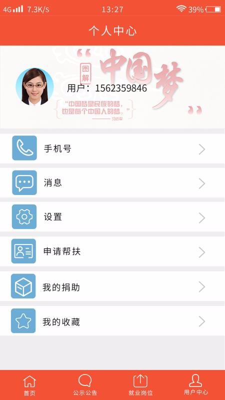 2、在用户中心,点击手机号、消息、设置、申请帮扶等