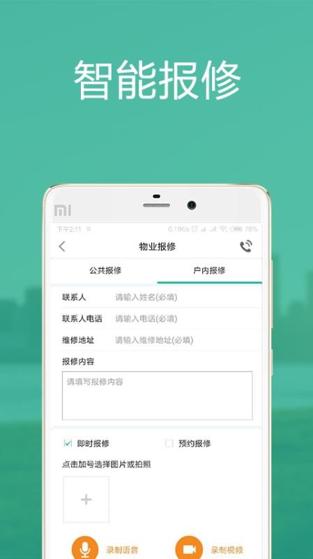 2、拥有公共报修和户内报修两种类型,并且支持录制语音和视频;
